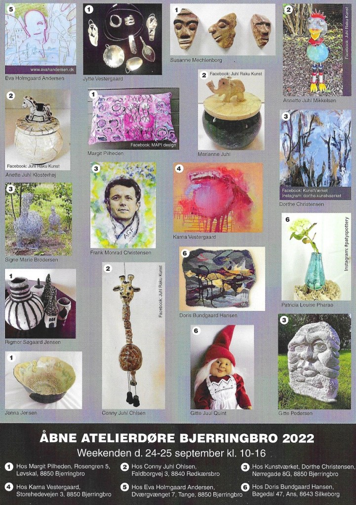 september 21, 2022september 21, 2022frankskunstEfterlad en kommentar til Åbne Atelierdøre Bjerringbro Åbne Atelierdøre Bjerringbro ÅBNE ATELIERDØRE BJERRINGBRO 2022Weekenden d. 24. – 25. SeptemberJeg er gæstekunstner hos KunstVærketNørregade 8G, 8850 Bjerringbro Læs mere her : https://viborg-folkeblad.dk/artikel/gamle-kendinge-og-nye-ansigter-%C3%A5bner-d%C3%B8re-ind-til-kunsten-2022-9-13 Del dette: Share on X(Åbner i et nyt vindue) X Del på Facebook(Åbner i et nyt vindue) Facebook Like Henter... Relateret